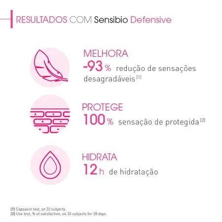 MODO DE AÇÃO BIOLÓGICO: Sensibio Defensive é o 1º cuidado fortalecedor ativo que protege, acalma e hidrata as peles sensíveis e reativas. A pesquisa avançada de BIODERMA desenvolveu a DEFENSIVE TECHNOLOGY, combinação exclusiva de ativos que age em ambos gatilhos da sensibilidade, inclusive os relacionados às agressões externas como poluição. Sensibio Defensive oferece ação antioxidante, calmante e fortalecedora da barreira de proteção para uma pele imediatamente acalmada, hidratada por 12h e protegida contra as agressões externas. A capacidade de auto defesa da pele é reforçada para que dia após dia, ela se torne mais resistente às agressões externas, como uso de ácidos, cosméticos e poluição, e menos sensível, de forma duradoura. RESULTADOS: 97% pele mais fortalecida contra agressões; 100% sensação de pele protegida; -73% redução de sensações desagradáveis. Fórmula hipoalergênica, sem corantes, parabenos e fragrância. Modo de Uso: Aplicar 2 vezes por dia (ou conforme orientação médica), manhã e noite, na pele limpa com produtos de limpeza da gama Sensibio. Em caso de irritações persistentes, consultar o médico dermatologista. Ingredientes: AQUA/WATER/EAU, GLYCERIN, DICAPRYLYL ETHER, PROPYLHEPTYL CAPRYLATE, BUTYLENE GLYCOL, GLYCERYL STEARATE CITRATE, GLYCOL PALMITATE, SQUALANE, SUCROSE STEARATE, MANGIFERA INDICA (MANGO) SEED BUTTER, PENTYLENE GLYCOL, ACRYLATES/C10-30 ALKYL ACRYLATE CROSSPOLYMER, CAPRYLYL GLYCOL, CARNOSINE, HYDROXYETHYL ACRYLATE/SODIUM ACRYLOYLDIMETHYL TAURATE COPOLYMER, MANNITOL, XYLITOL, TOCOPHEROL, SALVIA MILTIORRHIZA FLOWER/LEAF/ROOT EXTRACT, RHAMNOSE, GLYCINE SOJA (SOYBEAN) OIL, POLYSORBATE 60, SORBITAN ISOSTEARATE, PALMITOYL TETRAPEPTIDE-10. [BI 2012]